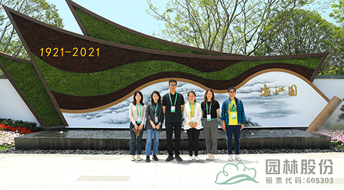 浙江園深化設計負責人高博、花境施工負責人張楠等在浙江園入口合影