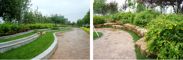 而在道路十字路口的節(jié)點(diǎn)處,則主要是用10cm×10cm的小花崗巖鋪地,鋪出來的路面整潔、平坦,看似簡單,實(shí)則對施工技術(shù)要求相當(dāng)高。草坪中的地面鋪裝,則采用花崗巖汀步,用錯(cuò)縫鋪裝法,兩塊花崗巖之間用草皮鑲嵌,就像給每塊花崗巖鑲了一道綠邊,與旁邊的草坪和諧地融為一體。貫穿整個(gè)工程的游憩步道,全部采用"人字形"的鋪裝方法,中間用透水磚、兩邊以花崗巖鑲邊,透水磚價(jià)格不高,用以鑲邊的花崗巖是利用了鋪裝中剩余的邊料,雖然用料簡單,但通過對技術(shù)的嚴(yán)格要求,鋪出的路面卻整潔而不失韻味,是一種實(shí)用、環(huán)保、節(jié)約的做法。