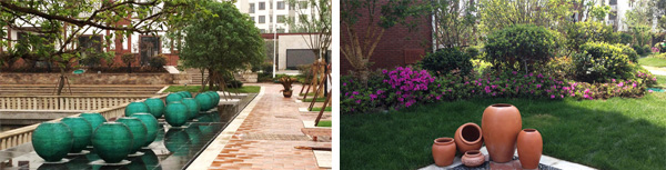 更值得一提的,還有隨處可見的草坪,隨著道路的延伸,草坪時而在不同的植物組團四周鋪展,時而與一棵棵高大的香樟、無患子為鄰,間或在小廣場的四周漫生一片綠意。大面積的草坪應(yīng)用,使得小區(qū)就像坐落在一片綠色的地毯中,映著白墻紅瓦的建筑,更顯綠意濃濃。不經(jīng)意見,更見幾只高低不一的紅陶瓷罐隨意散落在草坪里,在陽光的照耀下,泛出溫潤的光澤,一段靜謐的時光,仿佛就這樣凝固了。