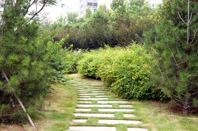 而在道路十字路口的節(jié)點(diǎn)處,則主要是用10cm×10cm的小花崗巖鋪地,鋪出來的路面整潔、平坦,看似簡(jiǎn)單,實(shí)則對(duì)施工技術(shù)要求相當(dāng)高。草坪中的地面鋪裝,則采用花崗巖汀步,用錯(cuò)縫鋪裝法,兩塊花崗巖之間用草皮鑲嵌,就像給每塊花崗巖鑲了一道綠邊,與旁邊的草坪和諧地融為一體。貫穿整個(gè)工程的游憩步道,全部采用“人字形”的鋪裝方法,中間用透水磚、兩邊以花崗巖鑲邊,透水磚價(jià)格不高,用以鑲邊的花崗巖是利用了鋪裝中剩余的邊料,雖然用料簡(jiǎn)單,但通過對(duì)技術(shù)的嚴(yán)格要求,鋪出的路面卻整潔而不失韻味,是一種實(shí)用、環(huán)保、節(jié)約的做法。