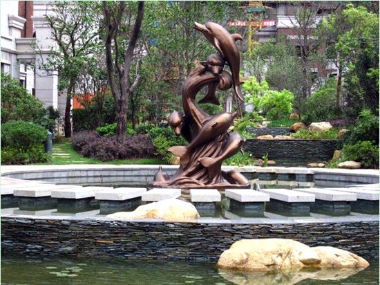 景觀小品是景觀中的點睛之筆,一些造型優(yōu)美的藝術(shù)小品,更是讓空間環(huán)境生動起來的關(guān)鍵因素。在保利·拉菲,帶有濃郁意大利氣息以及中西文化合璧的景觀小品隨處可見。入口處的歐式水景幕墻利用中國黑、黃銹石燒面、砂巖雕花巧妙結(jié)合,形成一幅精美的藝術(shù)畫面,幕墻中不斷噴涌的水流激起陣陣白色的漣漪,將后面寫有“保利·拉菲”字跡的景墻襯托得清爽大氣,在陽光照耀下,呈現(xiàn)出流暢、動感的畫面。特別引人注目的是模仿圓明園四大獸首制作的水景雕塑,牛首、豬首、猴首、虎首這四大獸首,形象上采取了西方動物的特征,融合了中國的傳統(tǒng)文化與西方的特色魅力,當細長的水流從四大獸首的口中源源不斷地吐出、落入前方的水池里時,就與從下而上噴出的涌泉形成互動,一上一下、一細一粗,前方再配以色彩絢麗的花草,形成一處動靜相宜、格調(diào)清新的水景。