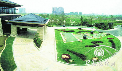 如2號樓大廳門前,在大面積草坪上,選用紅花檵木、金邊胡頹子、茶梅等一些小毛球,用中國書法的用筆法則,十分簡潔地“書寫”出點、橫、豎、鉤、提、撇、短撇、捺,即代表中國書法中筆畫大體的“永”字八法,這種匠心獨運(yùn)的植物配置,將園林造景手法與中國書法藝術(shù)完美配合,在園林景觀中融入了中國深厚的文化底蘊(yùn),景觀效果令人耳目一新,使酒店整體景觀品位得到提升,是中國傳統(tǒng)園林造景手法的典型運(yùn)用。