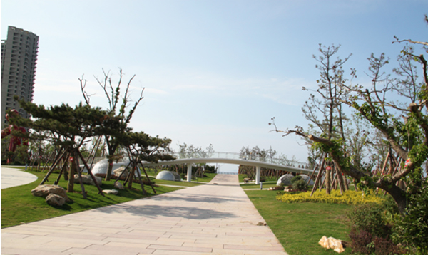 人行路橋高6米,長(zhǎng)60米,與園路相互連接,立于橋上,可觀四季美景,覽海灘盛宴,是廣場(chǎng)中觀景的好去處。