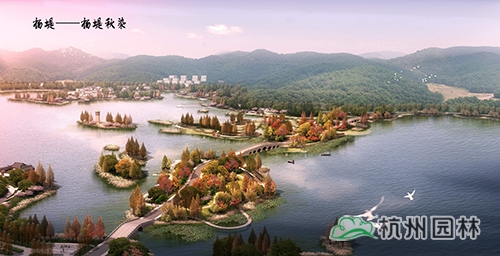 依據(jù)湘湖內(nèi)部自北向南的五堤,各堤路賦以色相植物,打造湘堤紫雨、越堤紅梅、楊堤秋染、長堤金風(fēng)、賀堤碧玉。