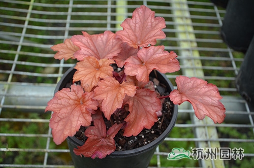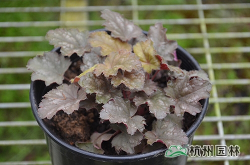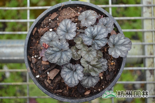 礬根又名小花腎形草,英文名為“Alum root”(因根部不規(guī)則膨脹而來),因此在引入中國的時候被翻譯成了“礬根”。礬根葉色繁多,且葉色會隨著季節(jié)、環(huán)境、溫度和光照條件的變化而改變。例如,‘蜜桃黃’在春天的時候,葉子展現出細膩的銀色光澤,成熟的葉片顏色會呈現紫色并略帶玫瑰紅;‘赤砂巖紅’的葉色會從桃紅色變?yōu)榱零~黃色,再變?yōu)榫G色帶有琥珀色;‘貴族紫’葉子的顏色會保持穩(wěn)定的紫色,冬天的葉子會變成銀色。