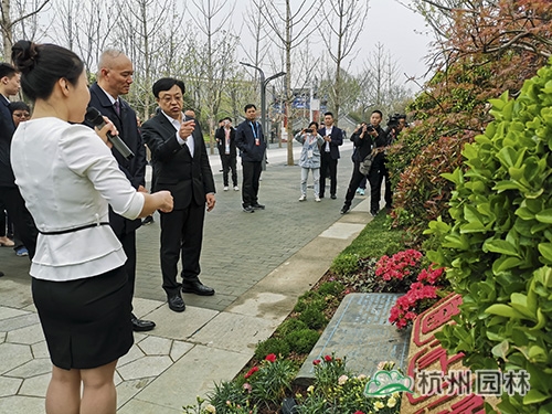 杭州市園林綠化股份有限公司董事長(zhǎng)吳光洪(右二)陪同中央政治局委員、北京市委書(shū)記蔡奇(左二)參觀浙江園