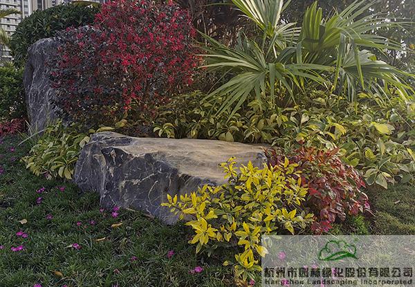 項(xiàng)目中應(yīng)用了許多景石,為了避免出現(xiàn)視覺(jué)的疲憊,每塊景石的形態(tài)、大小、植物配置都各有千秋。在一些入口和節(jié)點(diǎn)處,通過(guò)景石與色葉植物、開(kāi)花植物、球類(lèi)植物的有機(jī)搭配,營(yíng)造出一個(gè)個(gè)意趣盎然的花境景觀。