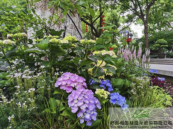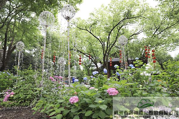 作為本次活動的贊助單位,杭州市園林綠化股份有限公司聯(lián)手繡球花產(chǎn)業(yè)國家創(chuàng)新聯(lián)盟,在城隍閣古樹平臺布置了《花落花開,年華度》為主題的八仙花景觀展示區(qū),“閣樓觀湖二十年,繡球花燈滿堂前”,通過代表浪漫與愛情之美的繡球花境組團,結(jié)合錯落有致的景觀挑燈和蜿蜒向前的時間軸序,營造出繁花如繡、前程似錦的美好寓意,以此向城隍閣開放20周年獻禮。