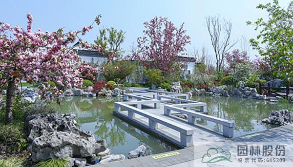 曲折的小橋?qū)@中的水系一分兩半,一邊是平面的水面,一邊是層層跌落的流水,動靜結(jié)合,意蘊悠遠,帶給人們更加豐富的景觀體驗。而不同的植物配置手法,也讓海棠顯得更加豐姿婥約,優(yōu)美動人。
