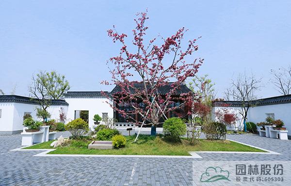 盆景園內(nèi),一棵棵造型別致的盆景,是海棠另一種形態(tài)的展現(xiàn)。院子中央,高大的‘豐盛海棠’正迎來盛花期,深粉色的花朵密密匝匝布滿枝頭,成為院中最引人矚目的風景,與院子里的五棵柿子樹搭配種植,組合成“五世同堂”的美好寓意,寓示著日子紅紅火火、闔家歡樂吉祥。在主建筑旁的天井處,采用盆景化的造園手法,運用南天竹、黑松、石子等元素營造的植物小景,自成一方小天地,與整個盆景園形成“園中園”的關(guān)系,展現(xiàn)出造園者的奇妙心思。