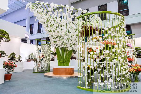 走進館內(nèi),各種浙江特色新優(yōu)園林園藝植物產(chǎn)品、花藝作品、盆景作品等,讓人忍不住駐足停留。最引人注目的,則是以一朵朵白色的蝴蝶蘭花朵與仿竹構(gòu)筑物營造的立體景觀,結(jié)合蒼翠欲滴的竹林背景和浙派山水盆景,營造出綠意盎然、生機無限的風景畫卷。寓意浙江是“綠水青山就是金山銀山”理論的發(fā)源地,表現(xiàn)浙江始終踐行“綠水青山就是金山銀山”的理念、大力推進生態(tài)文明建設取得的巨大成就。