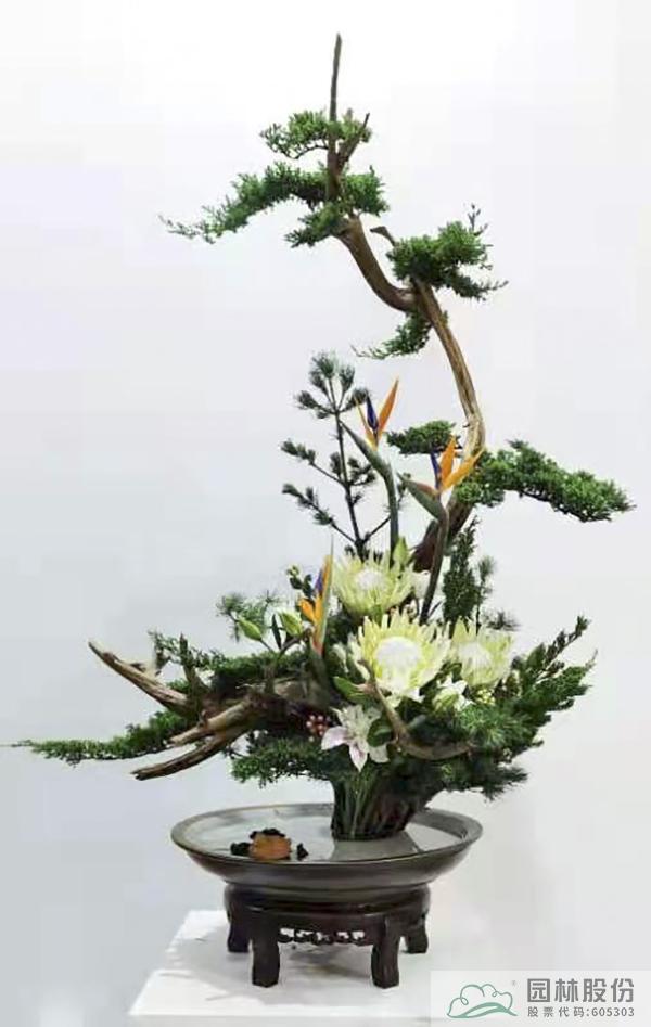另有極富意境的《云崖青嶠》插花作品,選崖柏、龍柏、鋪地柏、五針松、帝皇花、重瓣百合花、粉色和白色金絲桃、天堂鳥,以成云崖青嶠之作。云為雅意,崖寓故訓,青色入觀,嶠在畫外。如此,松風若過,花開舒卷,青紅果結(jié),臨水照影。清澗之曲,碧松之陰,相映成趣,著手成春矣。