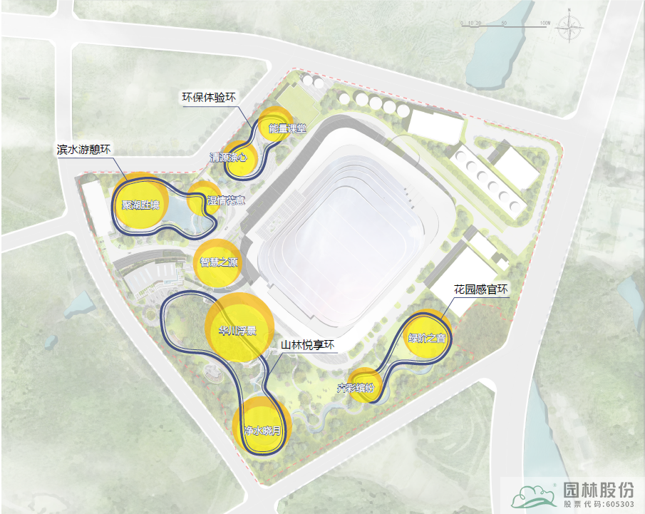 四環(huán):環(huán)保體驗(yàn)環(huán)、濱水游憩環(huán)、山林悅享環(huán)、花園感官環(huán);