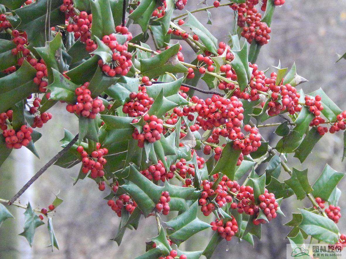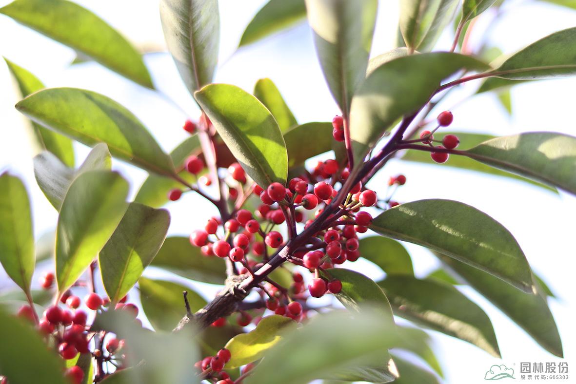 鐵冬青:其葉子四季常青,故名鐵冬青。為常綠喬木或灌木,高可達(dá)20米,葉全緣。果實(shí)紅色,紅若丹珠,小巧可人。掛果期長(zhǎng),能從10月一直持續(xù)至來年3月。因有多子多孫,興旺發(fā)達(dá)之意,在民間俗稱“萬(wàn)子千紅樹”。樹皮或根皮為中藥“救必應(yīng)”,具清熱解毒,利濕的功效。為優(yōu)良觀果樹種,適宜在園林中孤植或群植。