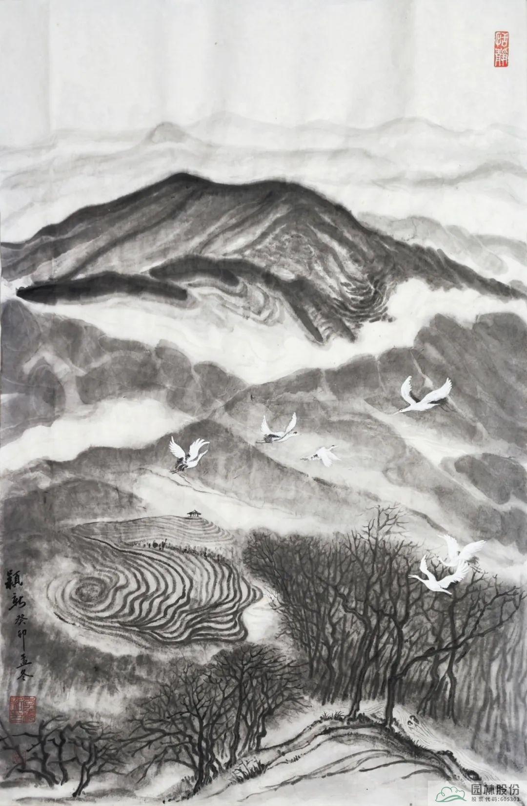 其中,杭州市園林綠化股份有限公司辦公室主任李穎新以徑山美景為創(chuàng)作內(nèi)容的書畫作品成功入選前20名。作品以杭州徑山及國(guó)家級(jí)美麗休閑鄉(xiāng)村-小古城村的自然景觀、鄉(xiāng)村風(fēng)情、茶園風(fēng)貌、翩翩白鷺等作為創(chuàng)作素材,主要表達(dá)在新時(shí)代背景下,隨著鄉(xiāng)村振興戰(zhàn)略的全面推進(jìn),一幅幅人與自然和諧共生的美麗畫卷正在神州大地徐徐展現(xiàn)。圖中山巒起伏、云霧氤氳、茶園連綿、溪水潺潺、白鷺紛飛……共同繪就一幅意境唯美的鄉(xiāng)村風(fēng)情畫卷,留下一段令人念念不忘的鄉(xiāng)愁記憶。