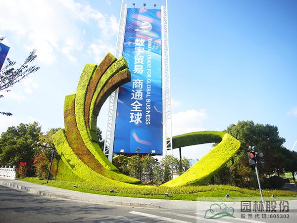 為增加數(shù)貿(mào)展會(huì)主題在邊側(cè)帶內(nèi)設(shè)置3座綠雕:杭扇-以扇子造型主題的全球數(shù)字貿(mào)易博覽會(huì)綠雕,展-以全球數(shù)字貿(mào)易博覽會(huì)會(huì)徽造型綠雕,數(shù)貿(mào)-以飄帶造型主題的“數(shù)貿(mào)錢(qián)潮 杭向未來(lái)”綠雕。綠雕植物均采用佛甲草和五色草搭配,周邊采用三角梅及花鏡植物配置。港南大道島頭花鏡運(yùn)用金姬錐、彩葉球、細(xì)葉芒、塞娜等植物來(lái)強(qiáng)化迎賓氣氛,通過(guò)多年生地被草花,結(jié)合精致植物組團(tuán)+特色綠雕,共同營(yíng)造多彩氛圍,打造熱烈迎賓門(mén)戶。