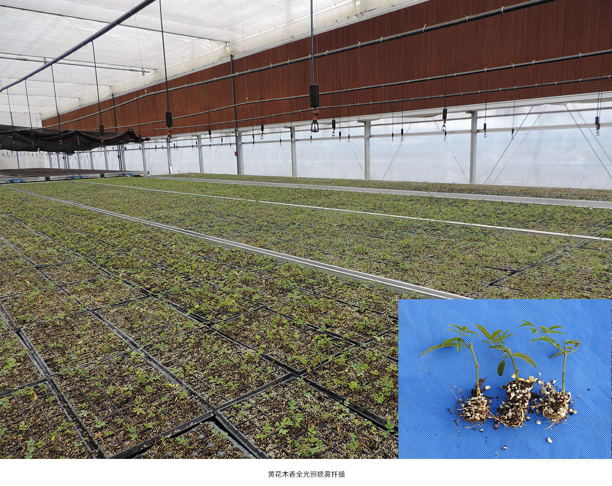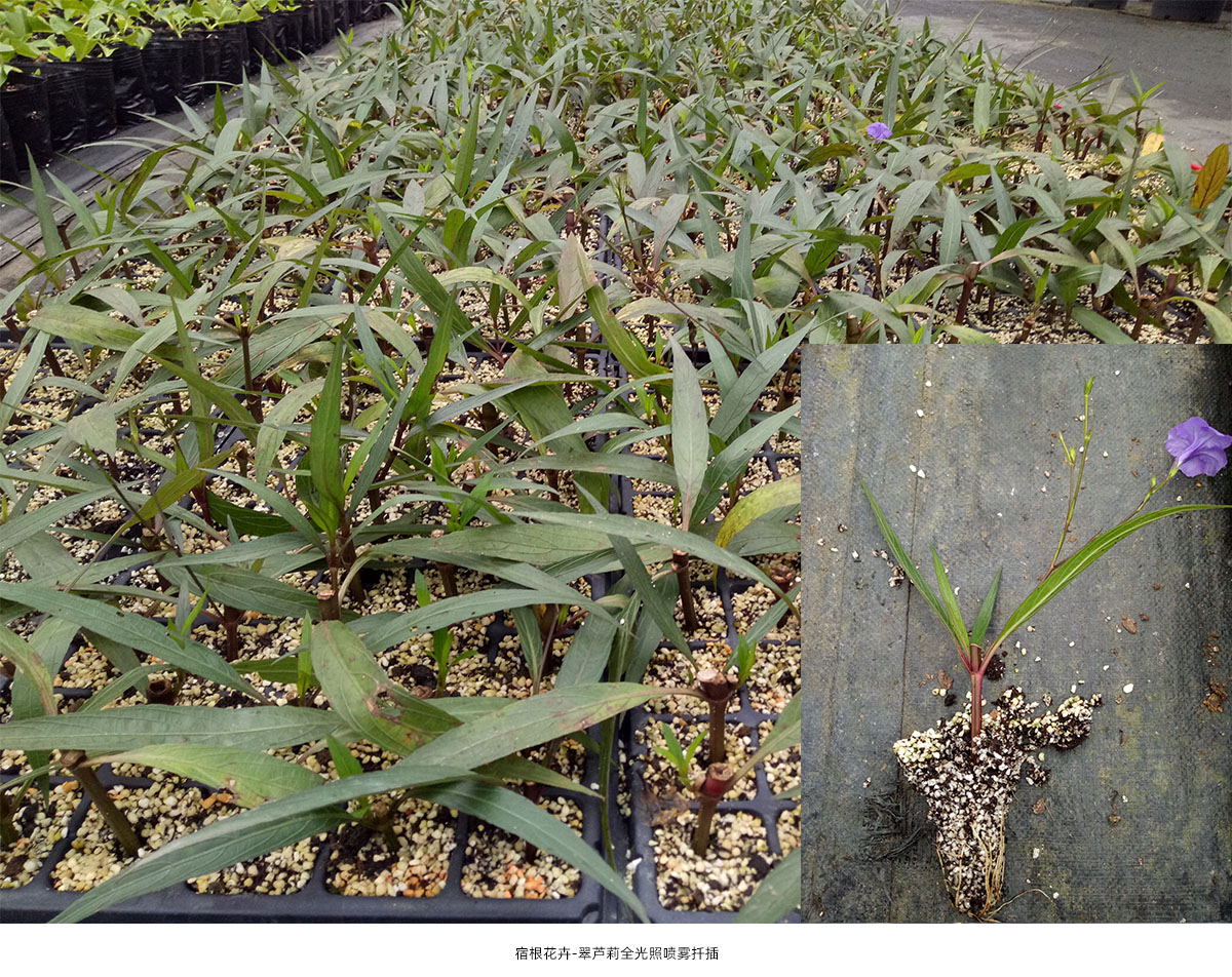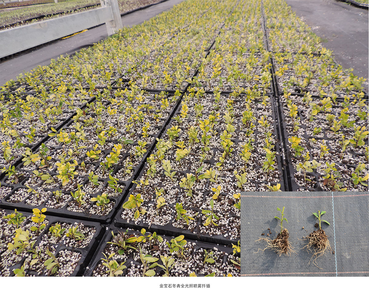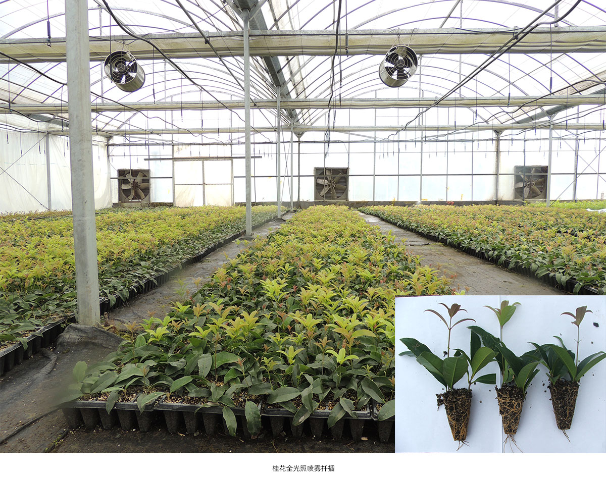 全光照噴霧扦插技術(shù)具有生根期短、成活率高和操作簡(jiǎn)單等優(yōu)點(diǎn)。研究院已建立了桂花、冬青、降香黃檀、新優(yōu)宿根植物等數(shù)百種植物的全光照噴霧扦插技術(shù)體系,年度育苗量200多萬(wàn)。